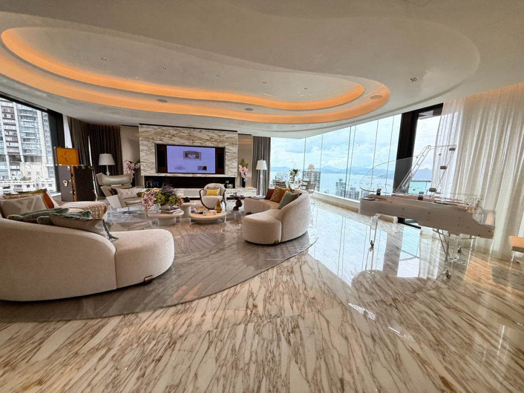 至于顶层三复式户,位处52楼、53楼、55楼,实用面积11,200方呎,单位内设私人升降机。其中52楼为客厅及饭厅范围,左右两侧外连双平台,厅区设有旋转楼梯通往上层。53楼为睡区,提供3间套房及家庭间。再往上的55楼为「总统套间」,设有健身房、衣帽间、及特大浴室等。而天台面积有约2,050方呎。上述「巨无霸」单位提供超过10个洗手间及浴室。