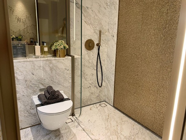 洗手间以画上花纹的玻璃门作分隔,增强透光感及单位空间感,设计师以多块镜面取代传统瓷砖墙身,方便住户出门前整理仪容。